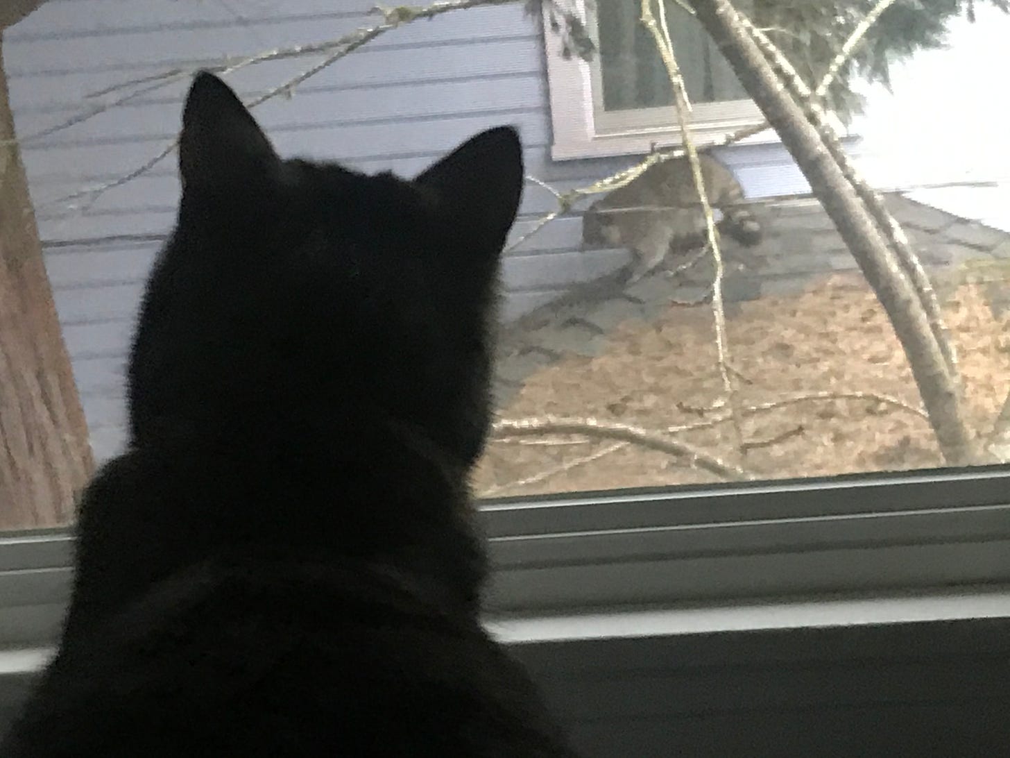 The vile raccoon, testing windows, didn’t know he was being watched himself. Gus doesn’t miss a thing, and that’s why Sunny let him come along on Poop Patrol. Blind Sunny thinks Gus is undisciplined, sometimes, but she knows talent when she sees it.