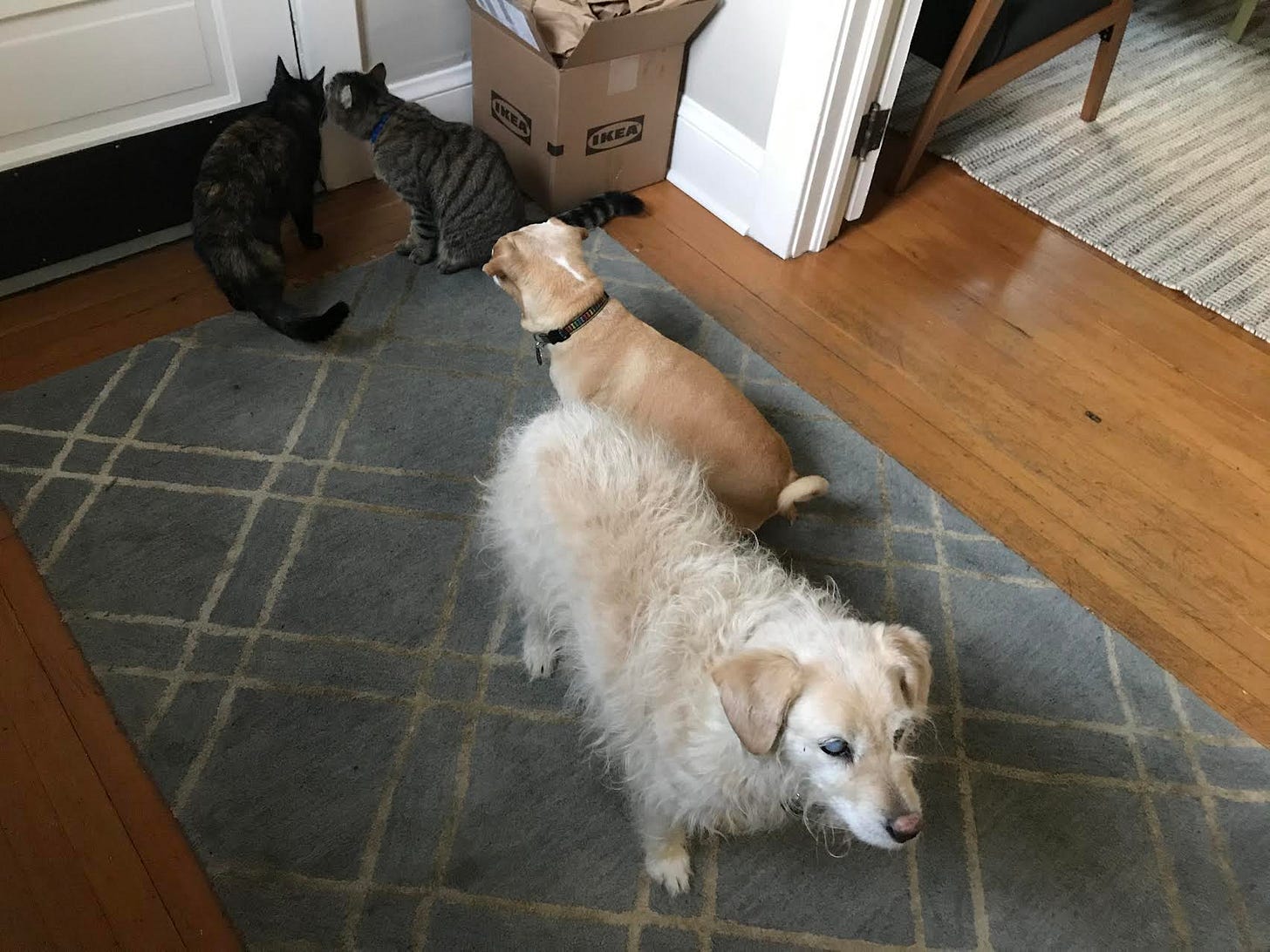 Sunny huffs at Rosie sometimes, just for fun to make her yell and run away. When Toby showed up a couple years after Sunny, however, Rosie decided she wouldn’t take getting pushed around by two dogs. Once Toby tried to jump onto the couch, not knowing Rosie was there, and she clubbed him on the top of his head. No claws, just a melon thump you could hear from the kitchen. They get along fine now, probably because Toby never tries to boss Rosie.