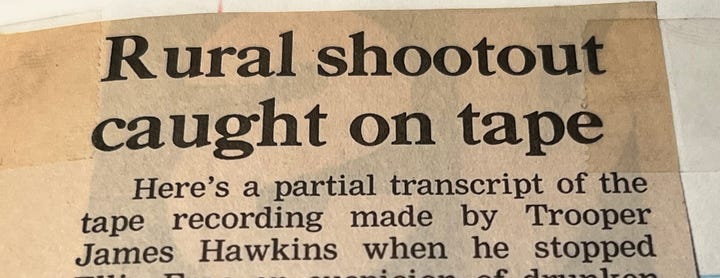 Police didn’t have body cameras then, but Hawkins had a tape recorder in his shirt pocket and was recording the DUII arrest for evidence. The audio was remarkable at the time and I can still hear the alarm and tension in the trooper’s voice. The district attorney’s office played the tape at a news conference several days later when they announced the shooting was justified. We ran a transcript of it in the newspaper along with my story. Nobody was online then but in print we listed the phone number of our “Guardline,” where you could call up and listen to the recording yourself.